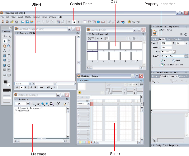 Director has existed since 1985, though it originally had the name MacroMind VideoWorks. The MacroMind company later merged with Paracomp to become Macromedia. It was meant for the easy creation of applications without the need to learn a more advanced language like C++, while still remaining powerful and flexible. Director provided a movie metaphor for application development — assets such as graphics and sound were cast members, and the on-screen interface was the stage, with the score, composed of many frames, controlling what the stage looked like. Interactivity was provided by scripts, which would manipulate the current frame of the movie.